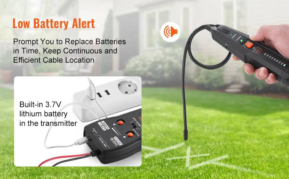 Questo localizzatore di cavi interrati è dotato di doppi avvisi tramite suono e spie luminose. Avvicinandosi al bersaglio, il suono aumenta gradualmente, aiutandoti a individuare con precisione la rottura del cavo. Che tu stia utilizzando il tracciante di cavi, il localizzatore di cavi per recinti per animali domestici o il rilevatore di valvole di irrigazione interrate, questi avvisi ti assicurano di non perdere alcun punto critico. Il suo trasmettitore offre anche avvisi di batteria scarica e utilizza batterie al carbonio stratificato per una semplice sostituzione. Con un massimo di 3 ore di lavoro continuo, questo strumento garantisce un servizio affidabile e ininterrotto.
