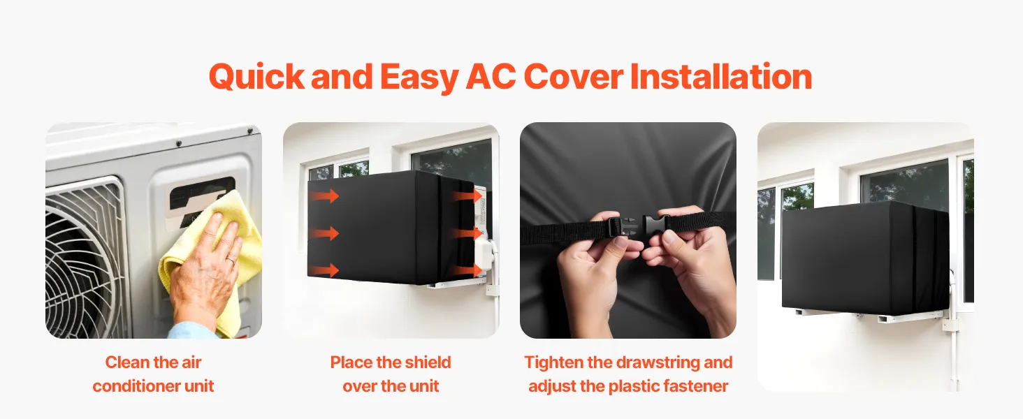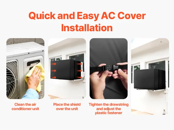 Installazione semplice: basta pulire l'unità, posizionare la copertura del condizionatore d'aria su di essa, stringere le corde e regolare le fascette di plastica. La copertura protettiva del condizionatore d'aria esterno è facile da installare
