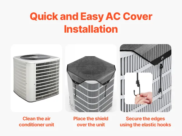 Installazione semplice: la copertura protettiva per condizionatore d'aria esterno è dotata di quattro ganci elastici regolabili, che consentono un facile fissaggio senza spostare l'unità. I ganci si adattano alle dimensioni dell'unità