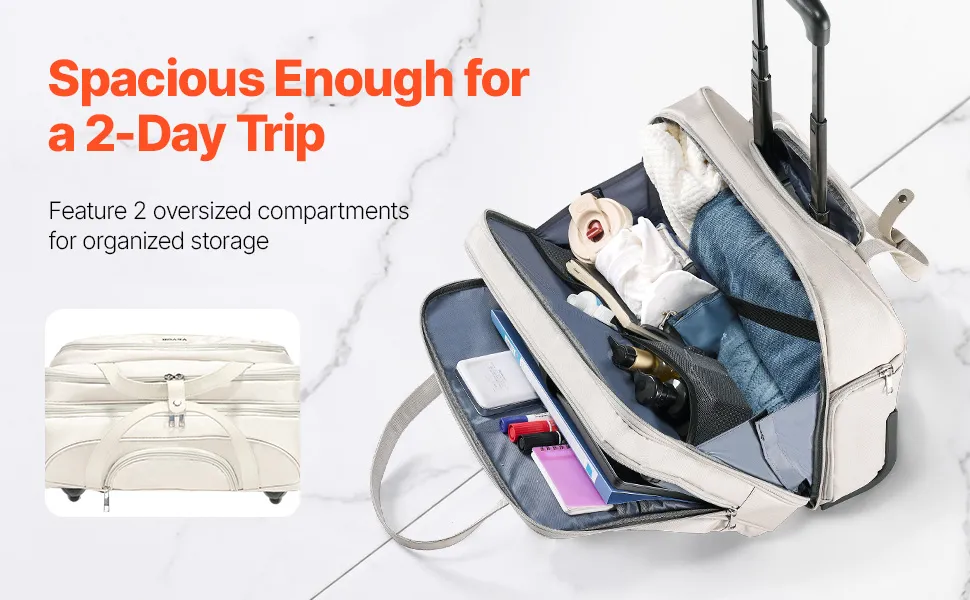 Archiviazione organizzata, facile accesso: questa valigetta con rotelle è dotata di due ampi scomparti principali per un'organizzazione efficiente dei viaggi. Lo scomparto di lavoro contiene laptop fino a 15,6 pollici insieme a file, mentre lo scomparto personale è ottimo per vestiti e articoli da toeletta. Ulteriori tasche anteriori e laterali ottimizzano lo spazio per gli elementi essenziali come forniture per ufficio, bottiglie d'acqua e altri piccoli oggetti