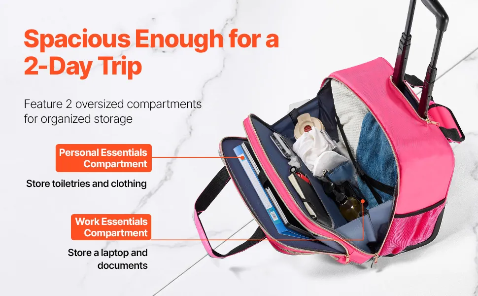 Archiviazione organizzata, facile accesso: questa valigetta con rotelle è dotata di due ampi scomparti principali per un'organizzazione efficiente dei viaggi. Lo scomparto di lavoro contiene laptop fino a 17,3 pollici / 43,9 cm insieme a file, mentre lo scomparto personale è ottimo per vestiti e articoli da toeletta