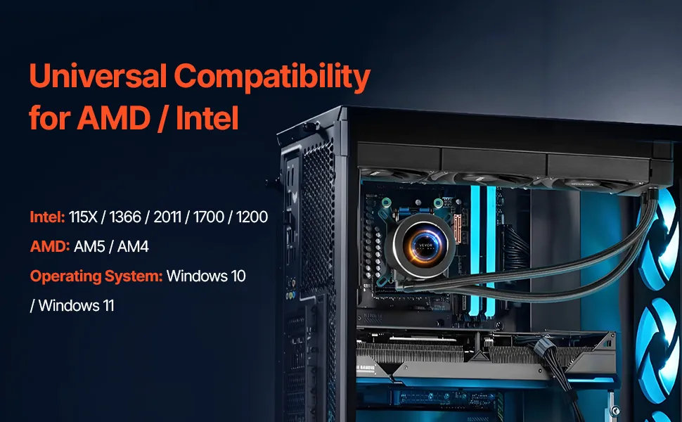 Compatibilità universale: questo dissipatore a liquido per CPU AIO supporta socket Intel (115X/1366/2011/1700/1200) e AMD (AM5/AM4), garantendo un'ampia compatibilità. È anche compatibile con Windows 10 e Windows 11, il che lo rende una scelta versatile per le esigenze di raffreddamento ad acqua del tuo PC