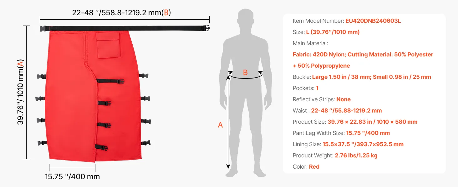 Progettato in modo pratico per essere indossato e rimosso rapidamente quando necessario. La cintura regolabile si adatta a taglie di vita da 22 a 48 pollici, rendendolo adatto a tutti i tipi di corpo, indipendentemente dal sesso, che tu indossi pantaloni da motosega.