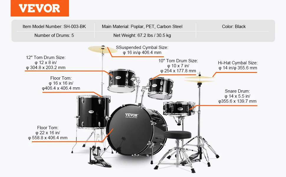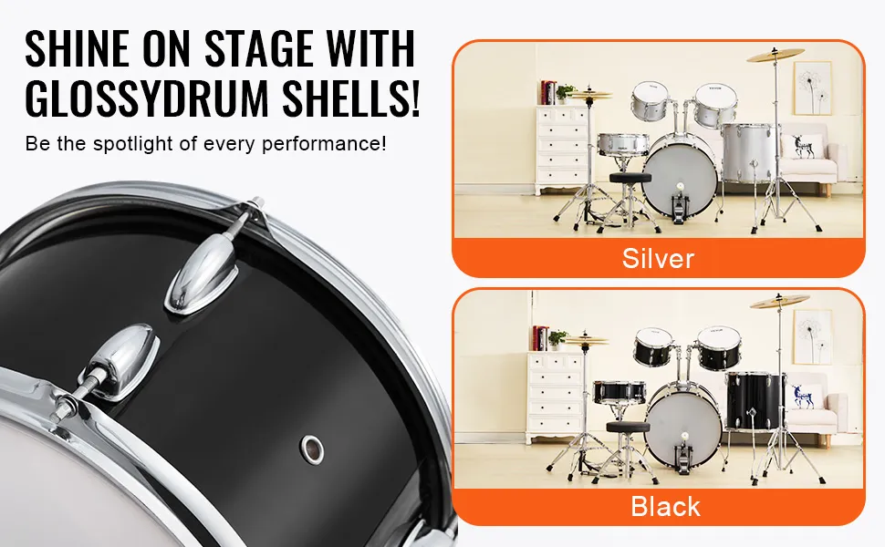 Il set di batteria per adulti VEVOR ha un'attraente finitura nera. Aggiunge fascino estetico al set di batteria. La finitura nera ha un aspetto elegante e professionale. Si adatta bene a qualsiasi arredamento domestico. Questi set di batteria hanno una finitura opaca, che ha un bell'aspetto. Inoltre, i tamburi e i supporti nascondono bene lo sporco e la polvere. Ciò significa che non è necessario pulirli spesso. Una finitura attraente lo rende un'aggiunta accattivante a qualsiasi stanza. Non solo è funzionale, ma ha anche un bell'aspetto. Quindi, questo lo rende un regalo perfetto per chiunque ami suonare la batteria.