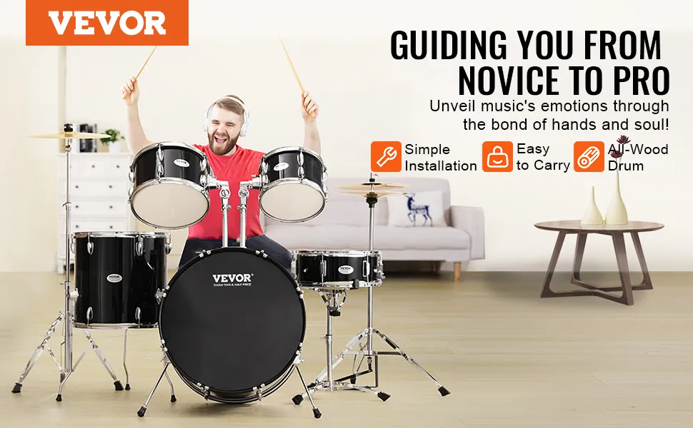 La batteria per adulti VEVOR è perfetta per l'uso domestico. È compatta e non occupa molto spazio. I tamburi e i supporti sono robusti, garantendo stabilità. Puoi installarla in qualsiasi stanza e iniziare a suonare subito. Questa batteria è pronta per essere suonata appena tirata fuori dalla scatola. Non c'è bisogno di ulteriore configurazione. Quindi, questo la rende ideale anche per l'uso domestico. Puoi esercitarti e suonarla quando vuoi. Le dimensioni compatte la rendono anche facile da spostare. Puoi portarla in stanze diverse o a casa di un amico.