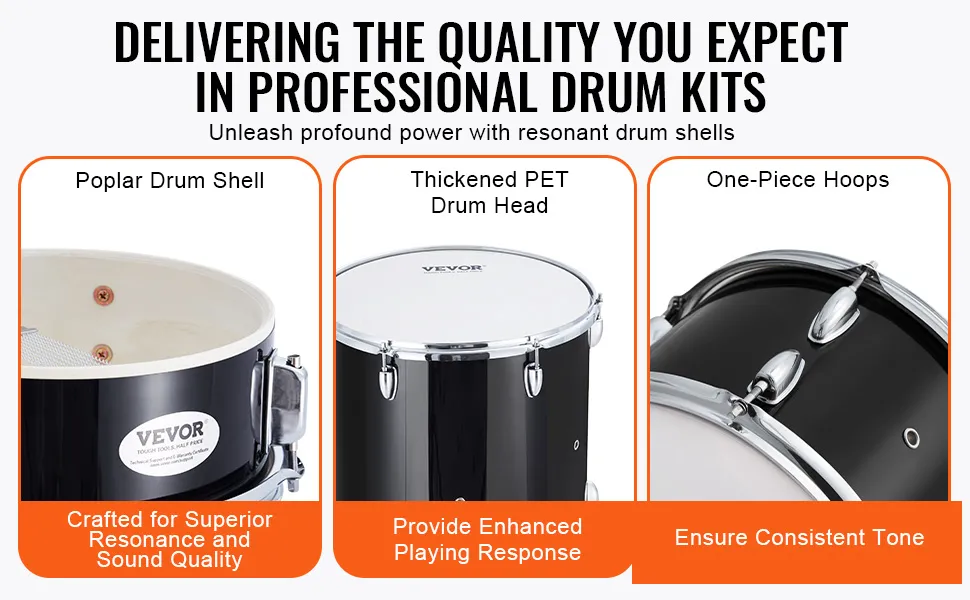 Scatena la qualità del suono professionale: migliora la tua esperienza con la batteria con la nostra batteria meticolosamente realizzata! I fusti dei tamburi sono realizzati in pioppo di alta qualità, garantendo toni caldi e risonanti ad ogni battito.