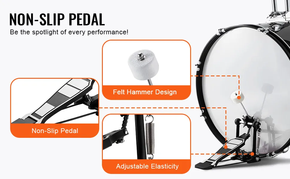 Migliora il tuo gioco di batteria con la nostra batteria completa di prim'ordine. Dotato di un pedale stabile che garantisce un supporto costante durante il gioco, il nostro set di batteria riduce al minimo i movimenti indesiderati.
