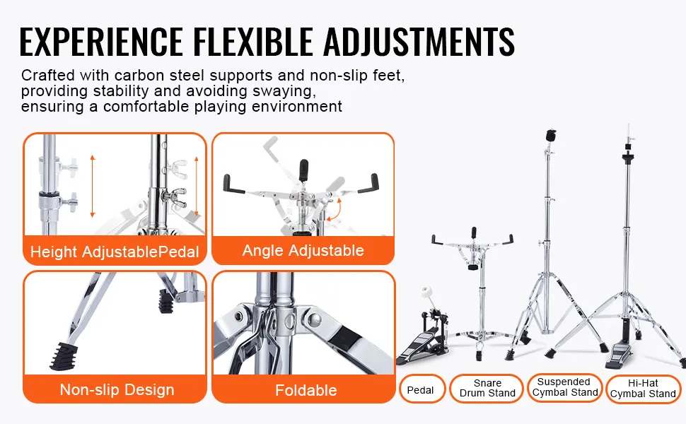 Supporto per batteria solido come la roccia: progettato per fornire stabilità incrollabile, il nostro robusto supporto in acciaio al carbonio supporta sia la regolazione dell'altezza che dell'angolazione, garantendo un ritmo costante ad ogni battito.