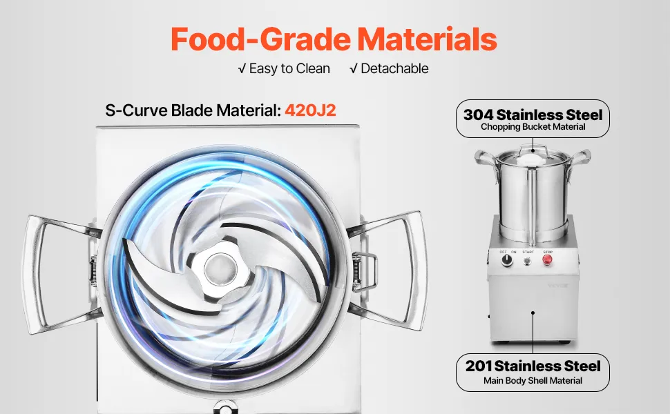 Materiale di qualità alimentare: tutte le parti a contatto con il cibo sono realizzate in acciaio inossidabile di qualità alimentare. Le lame e gli accessori sono staccabili e lavabili in lavastoviglie, rendendo la pulizia senza problemi.