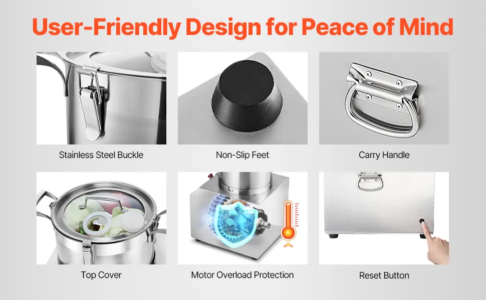 Il nostro robot da cucina è costruito con un corpo interamente in acciaio inossidabile con componenti facilmente smontabili e lavabili per una manutenzione. Puoi fidarti della qualità dei materiali che utilizziamo per garantire che il tuo cibo rimanga sicuro e delizioso.