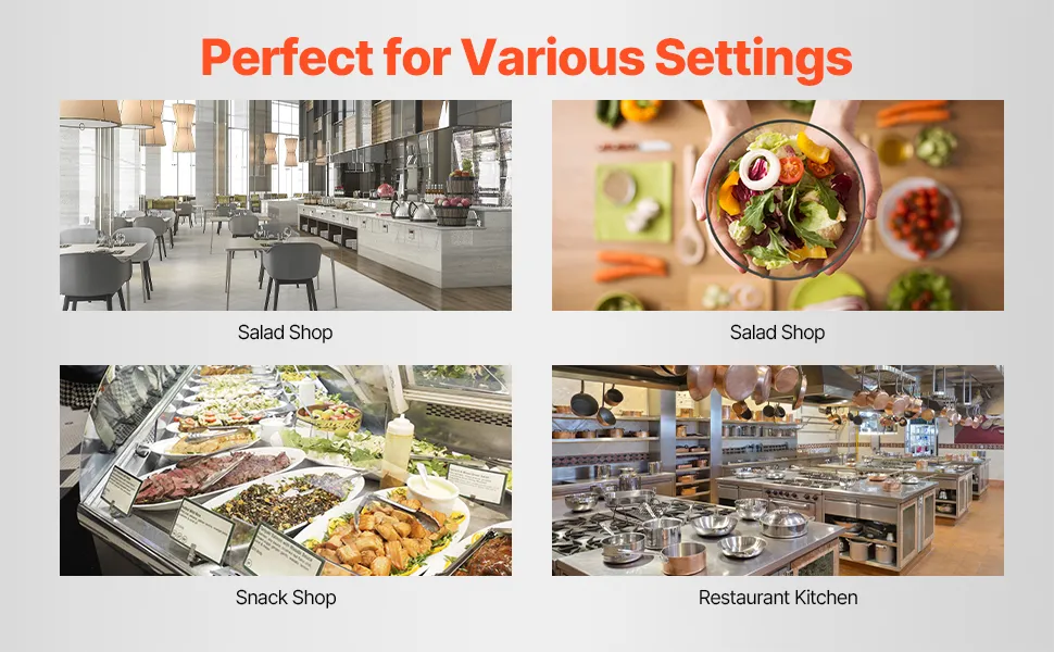 Ampia applicazione: compatto ed elegante, questo robot da cucina si adatta facilmente a qualsiasi spazio della cucina, rendendolo ideale per l'uso in hotel, bar per insalate, negozi di snack e cucine di ristoranti.