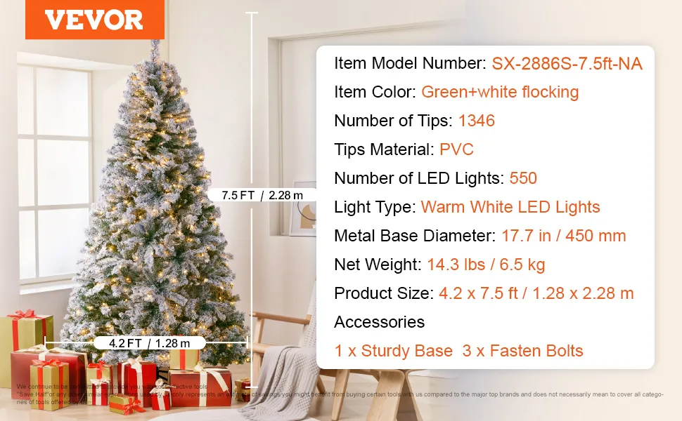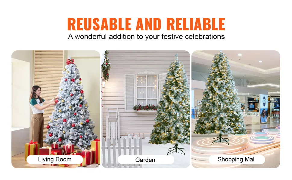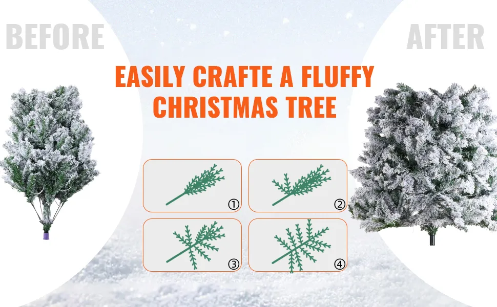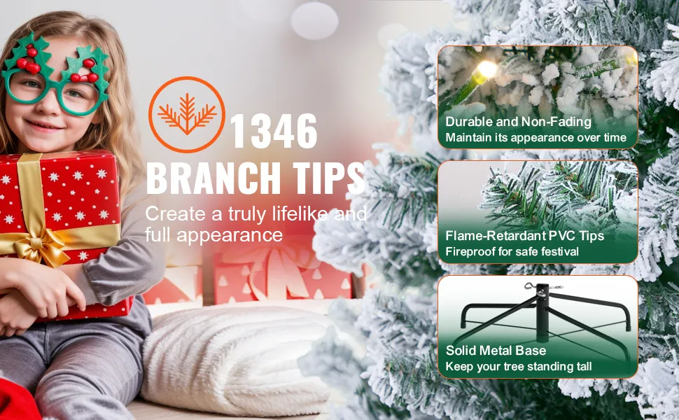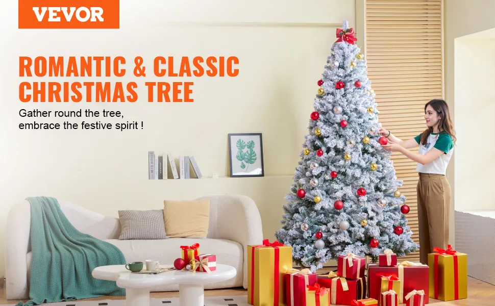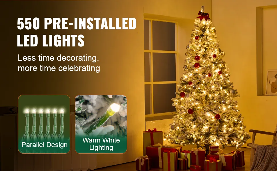 Lascia che l'albero di Natale floccato preilluminato VEVOR sia il fulcro delle tue feste, riempiendo la tua casa di calore e gioia. 1346 punte di rami conferiscono un aspetto rigoglioso e realistico, mentre 550 luci LED bianche calde creano un'atmosfera incantevole da custodire.