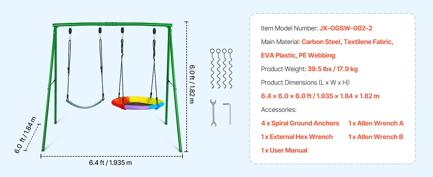 Struttura robusta: L'altalena da giardino con struttura ad A può sostenere fino a 199,6 kg. Il telaio in acciaio forma una base stabile e triangolare e può essere fissata in modo permanente al terreno utilizzando gli ancoraggi a spirale inclusi
