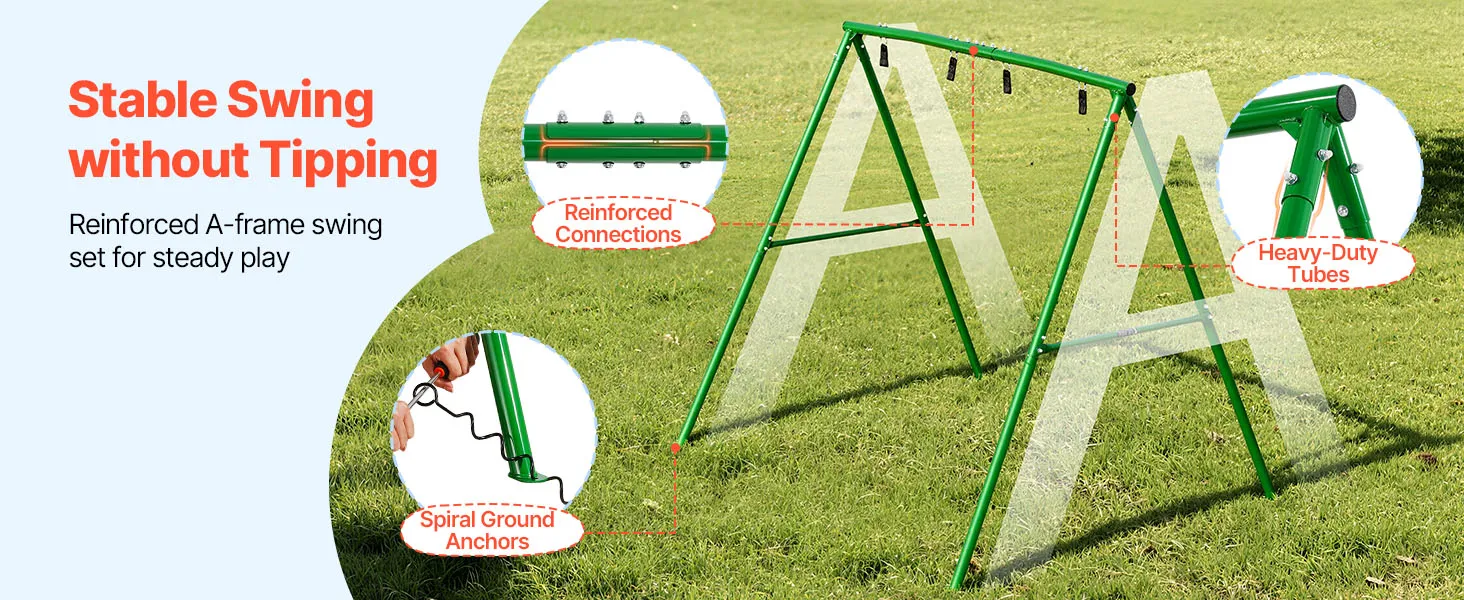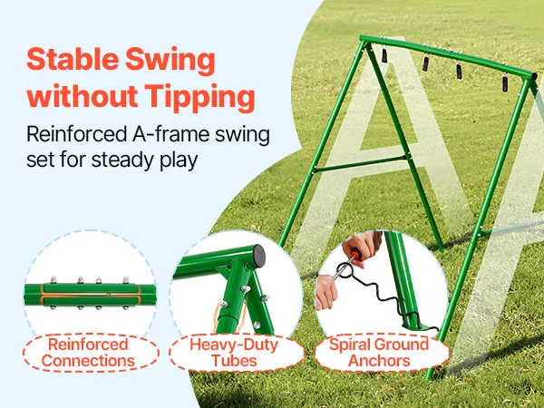 La struttura in acciaio a forma di A con manicotti rinforzati forma una struttura triangolare robusta e stabile. I robusti raccordi dei tubi contribuiscono alla stabilità complessiva dell'altalena, mentre gli ancoraggi a spirale fissano saldamente il telaio al terreno.