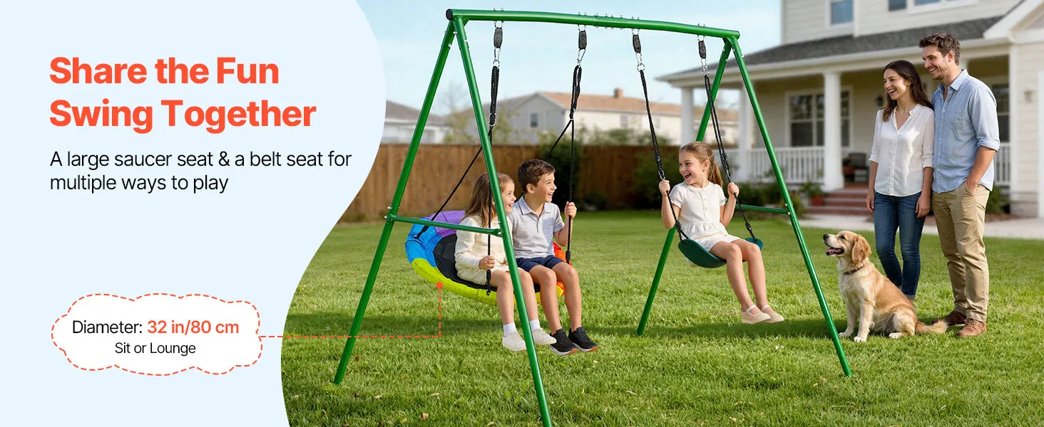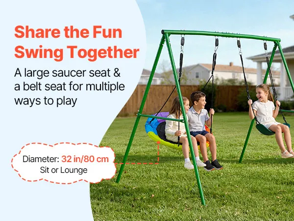 Questo set di altalena con struttura è dotato di due sedili: un grande disco rotondo e un'altalena con cinghia, e consente opzioni di gioco flessibili per più bambini che si dondolano insieme.