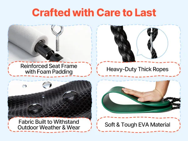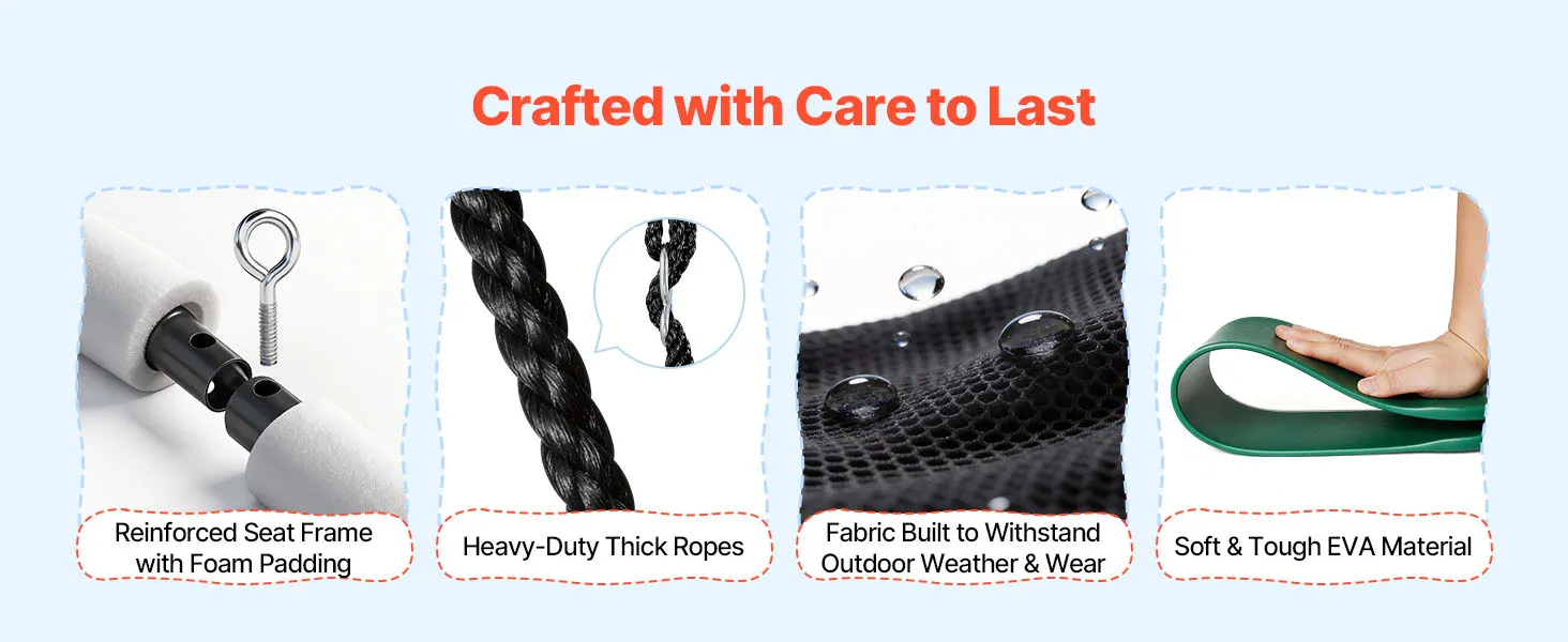 Il telaio del sedile rinforzato con imbottitura in schiuma offre stabilità e comfort. Il rivestimento del sedile e la cinghia sono adatti per un uso frequente. Le corde robuste e regolabili assicurano che l'altalena e il telaio rimangano saldamente in posizione.