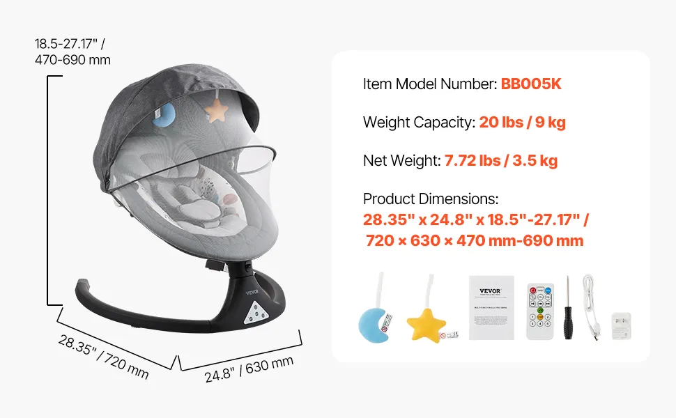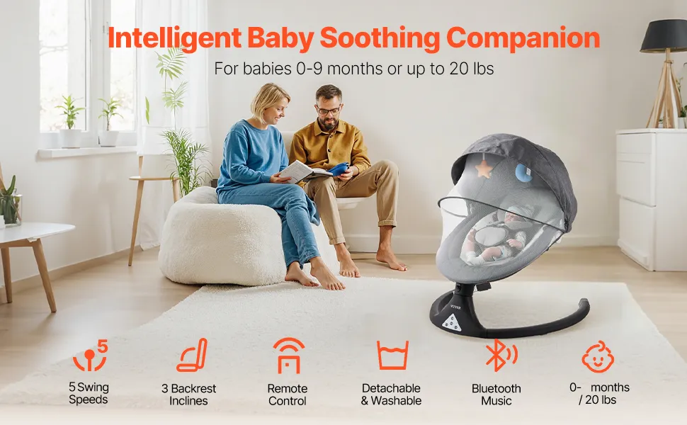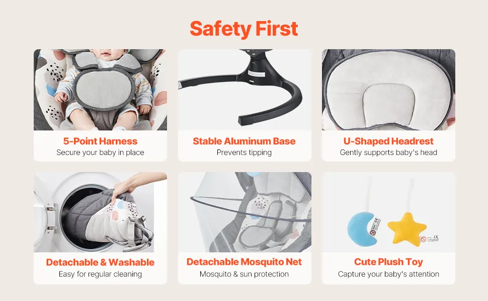 La nostra altalena per bambini ha5 velocità, 3 posizioni di seduta regolabili, pannello touch in PVC, telecomando, musica Bluetooth, 10 ninne nanne preimpostate, imbracatura di sicurezza a 5 punti, zanzariera e 2 adorabili giocattoli.