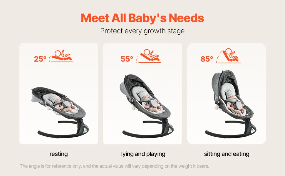 Adattato alla crescita del bambino: questa altalena per bambini offre 5 velocità di oscillazione delicate e 3 angoli di seduta regolabili, rendendo facile trovare il movimento e la posizione ideali per il tuo bambino, che stia facendo un pisolino, giocando o mangiando