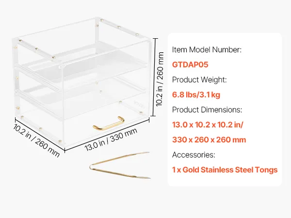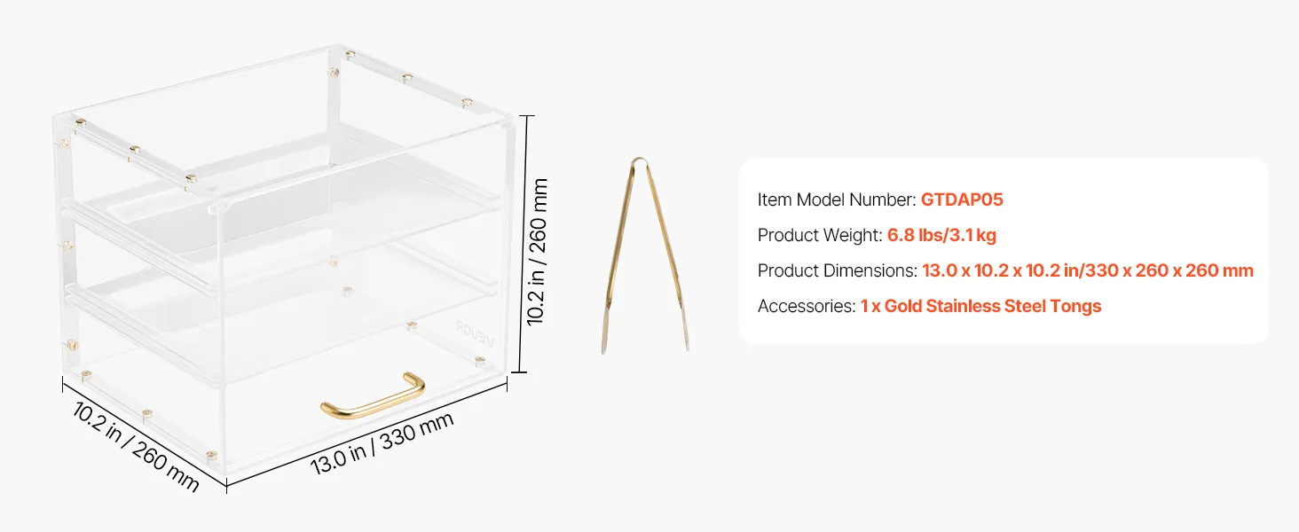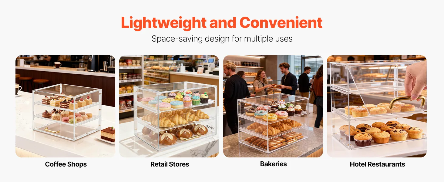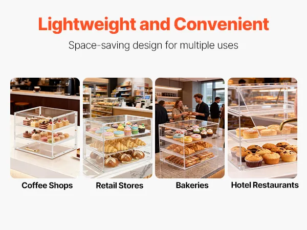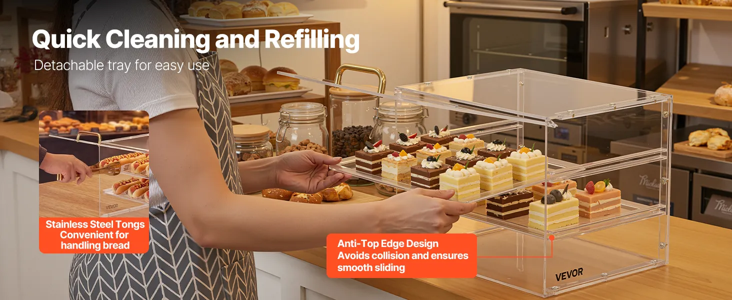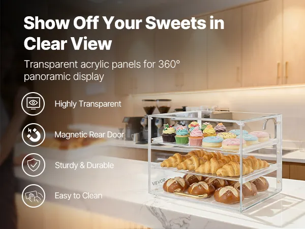 Questa vetrina per dolci utilizza un ripiano più spesso per una maggiore resistenza e durata. Realizzata in acrilico di alta qualità ad alta trasparenza, offre una visione cristallina a 360° dei vostri prodotti da forno.