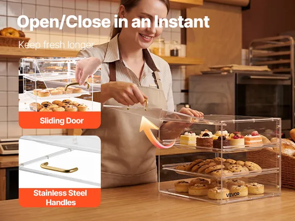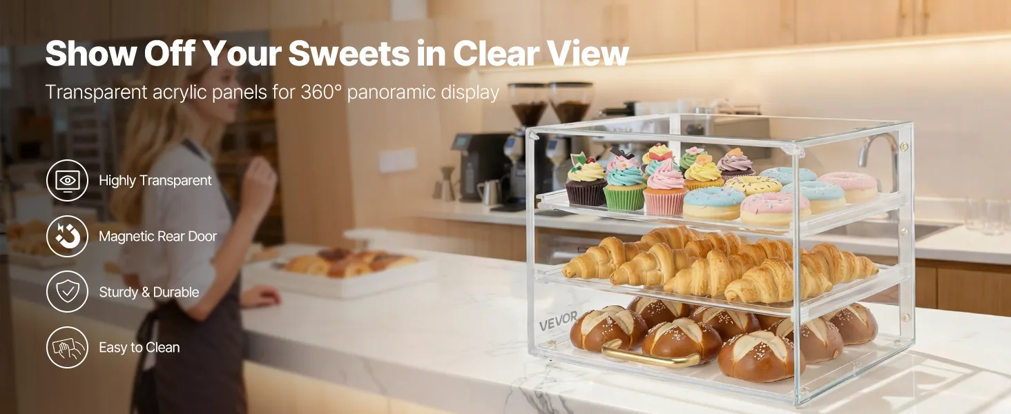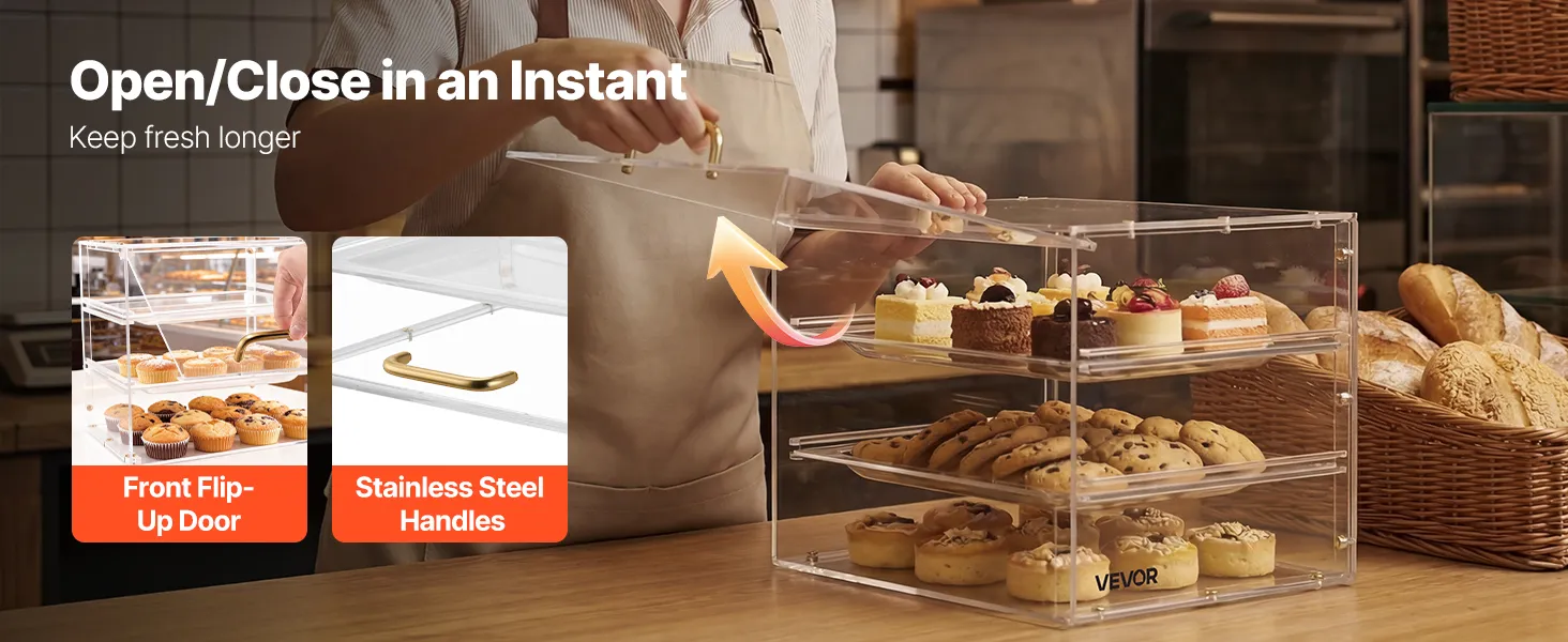 VEVOR Vetrina per Pasticceria 3 Ripiani da Banco, Espositore per Panetteria in Acrilico Trasparente con Anta a Ribalta, Vetrina Portapane in Acrilico per Torte Biscotti Dolci 330 x 260 x 260 mm