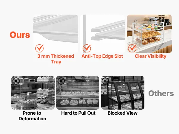 • Struttura in acrilico trasparente: realizzata in acrilico trasparente, la vetrina per pasticceria offre una trasparenza simile al vetro. La superficie liscia si pulisce in pochi secondi, consentendo ai clienti di vedere torte e pasticcini in modo chiaro, per un'esposizione irresistibile