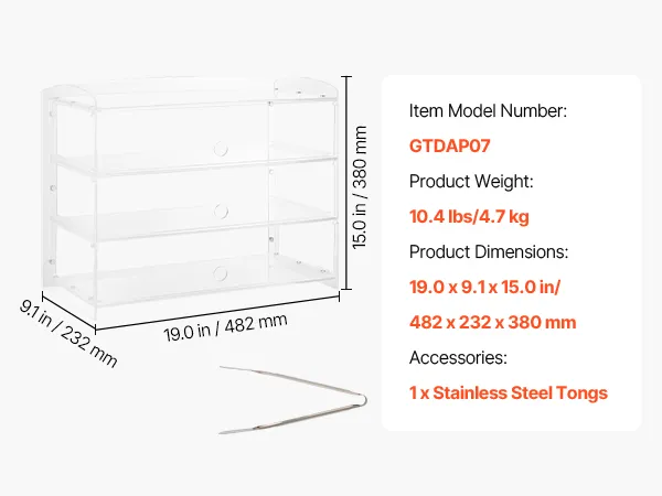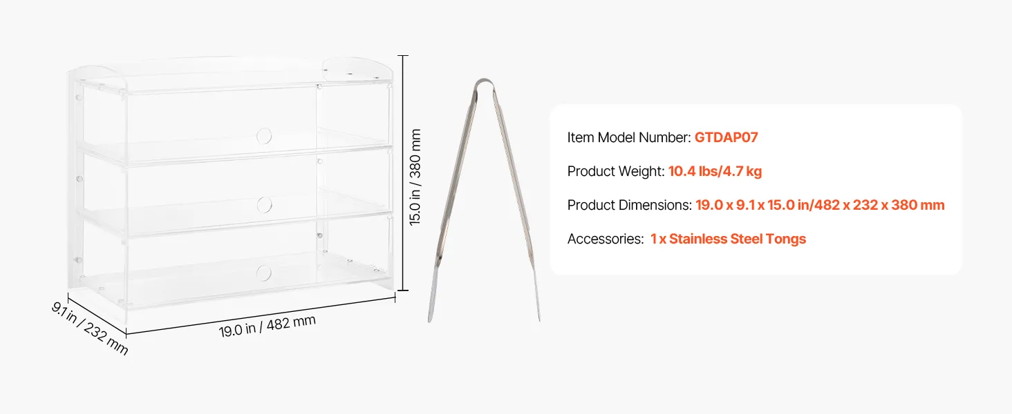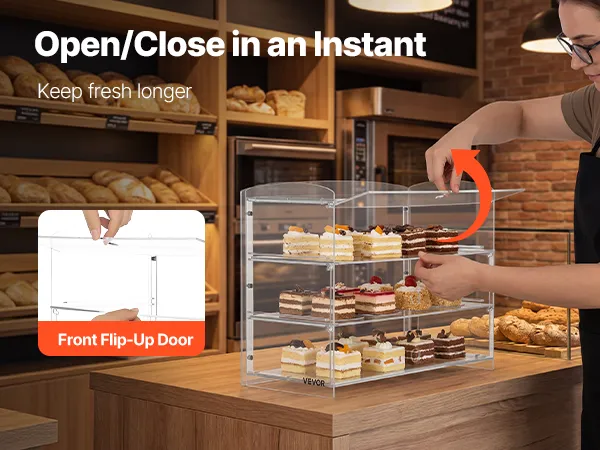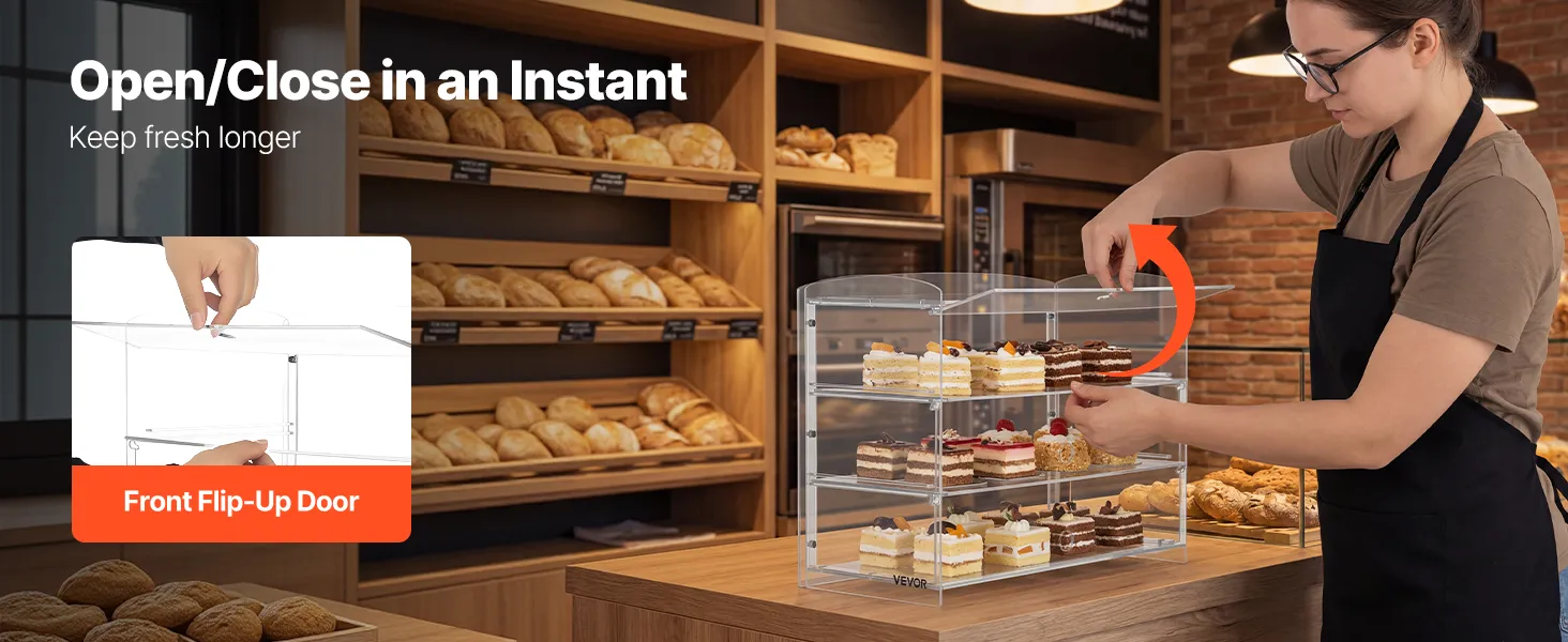 VEVOR Vetrina per Pasticceria da Banco Espositore a 3 Ripiani da Banco in Acrilico Vetrina Portapane Torte con Anta a Ribalta per Biscotti, Torte, Ciambelle, da Panetteria 482 x 232 x 380 mm