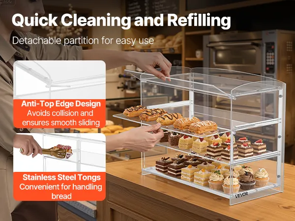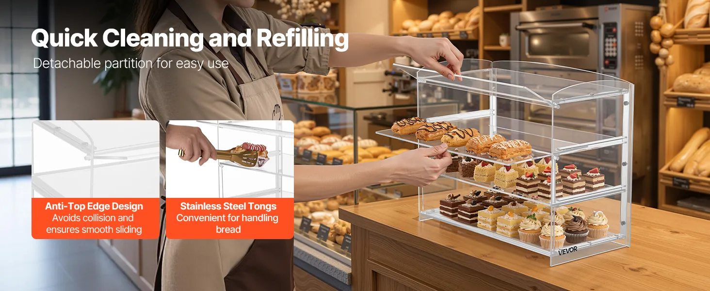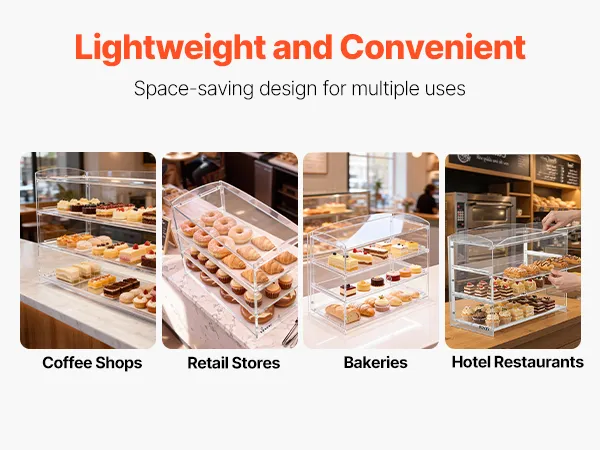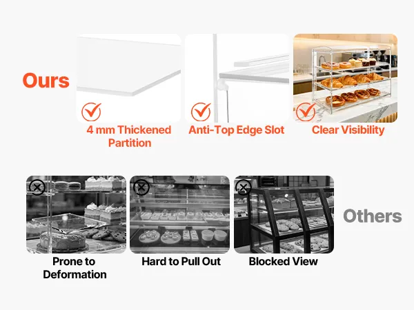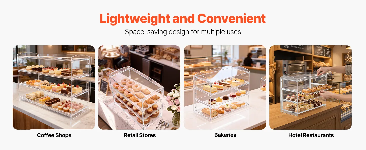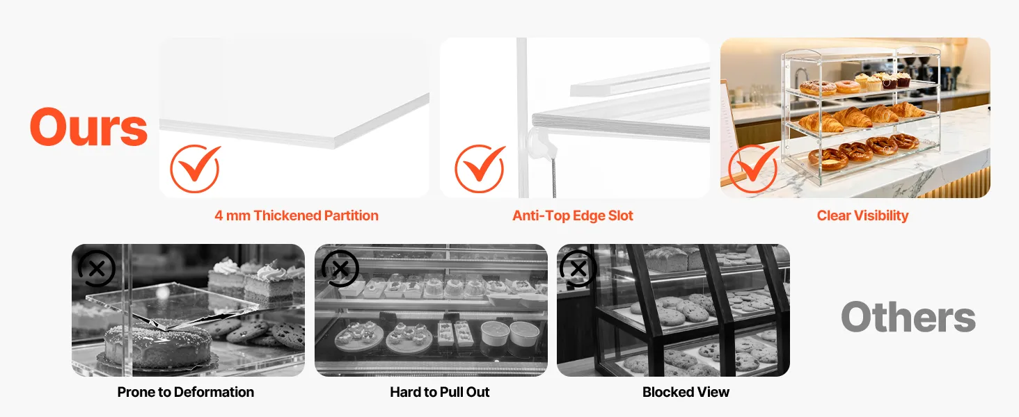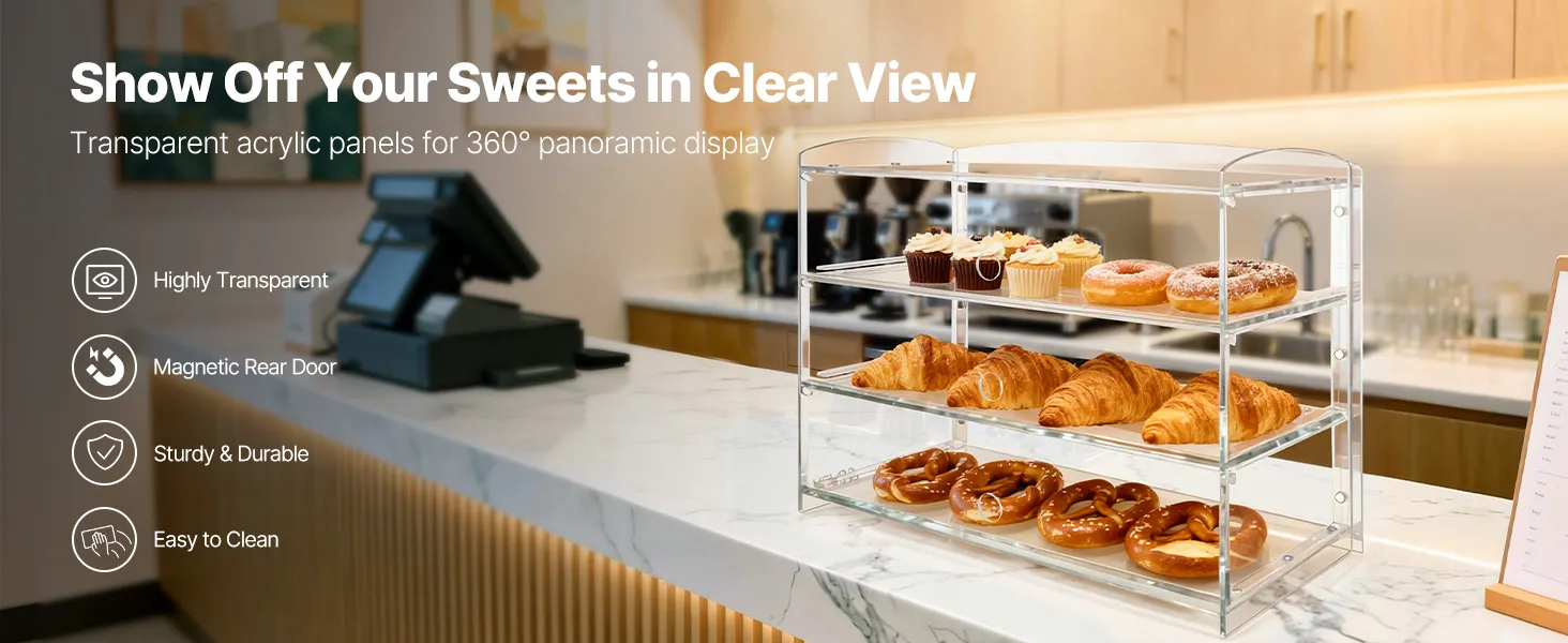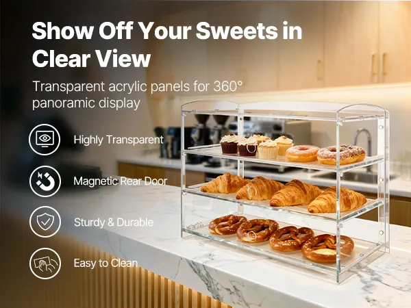 Questa vetrina per dolci utilizza un ripiano più spesso per una maggiore resistenza e durata. Realizzata in acrilico di alta qualità ad alta trasparenza, offre una visione cristallina a 360° dei vostri prodotti da forno.