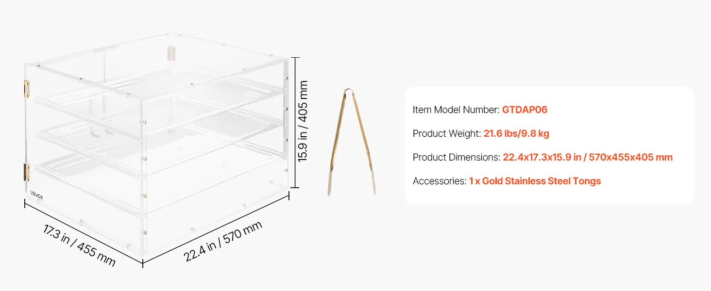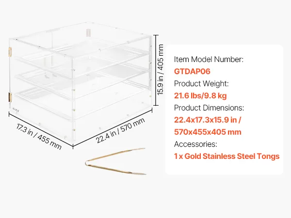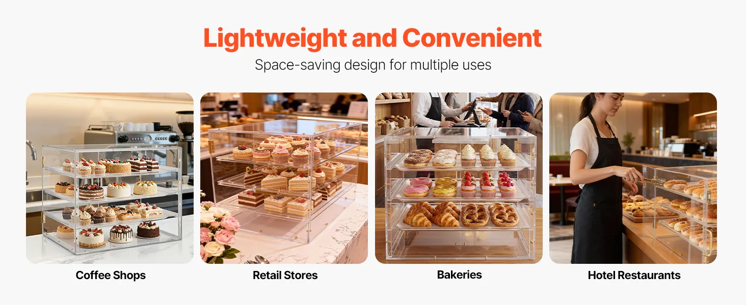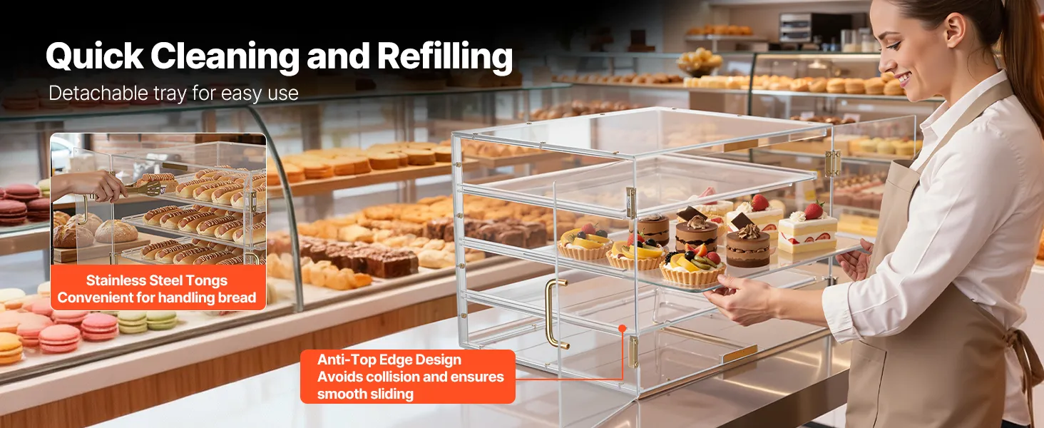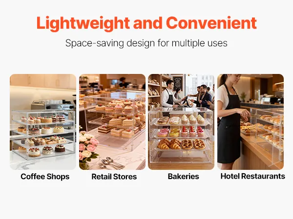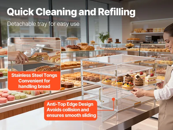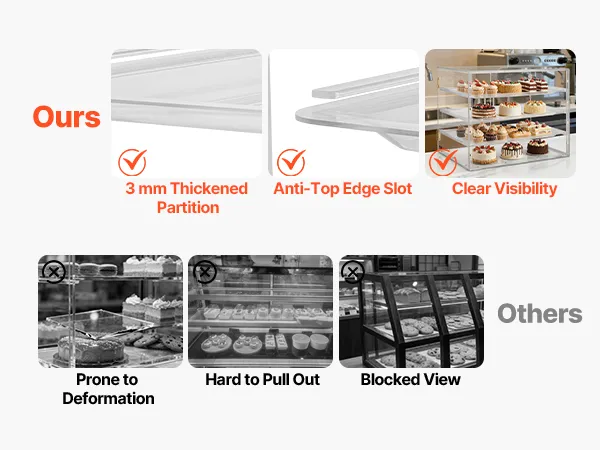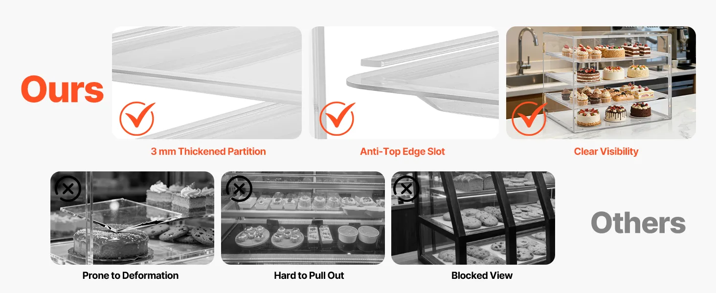 Questa vetrina per dolci utilizza un ripiano più spesso per una maggiore resistenza e durata. Realizzata in acrilico di alta qualità ad alta trasparenza, offre una visione cristallina a 360° dei vostri prodotti da forno.
