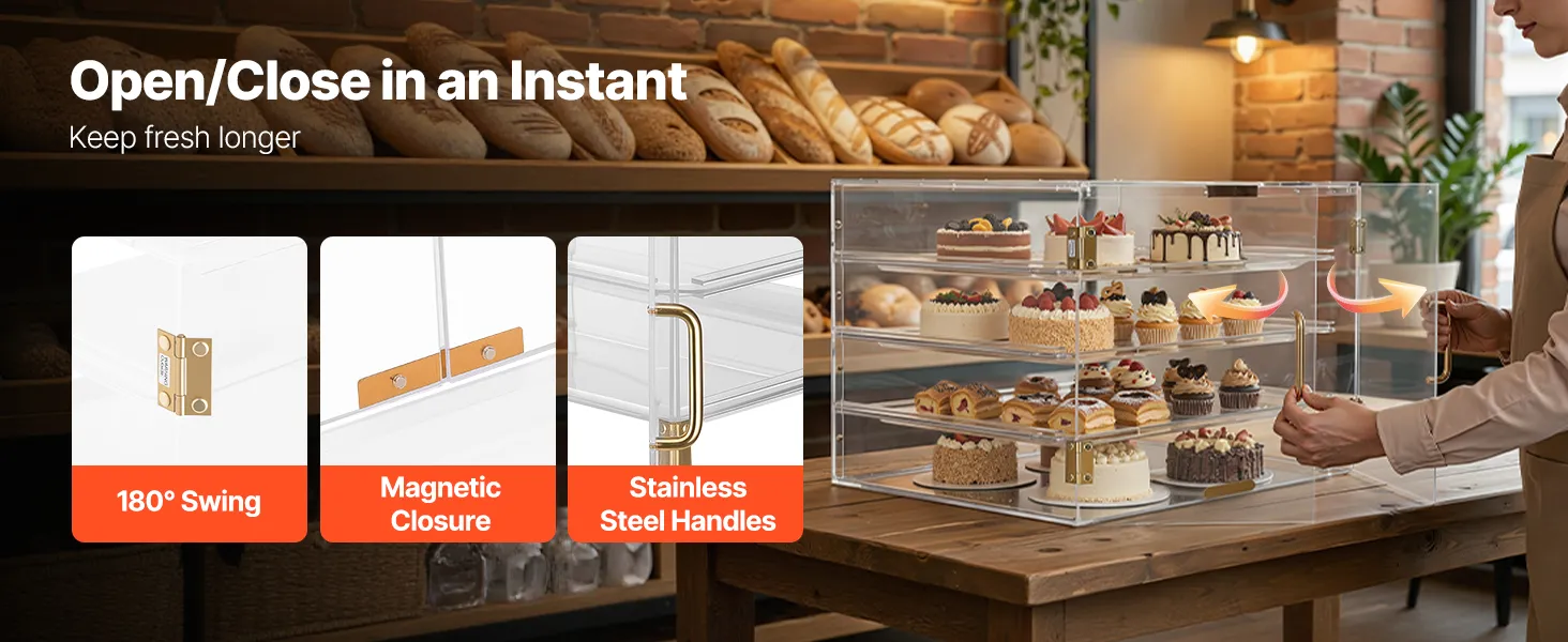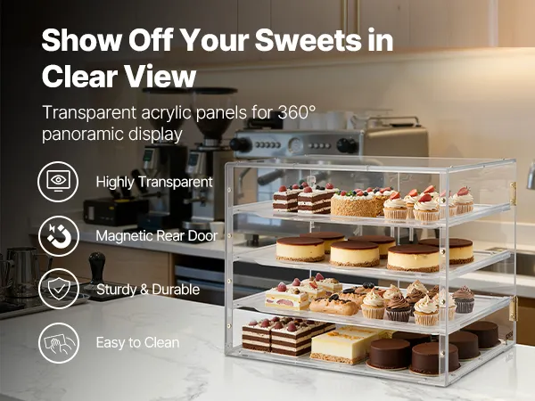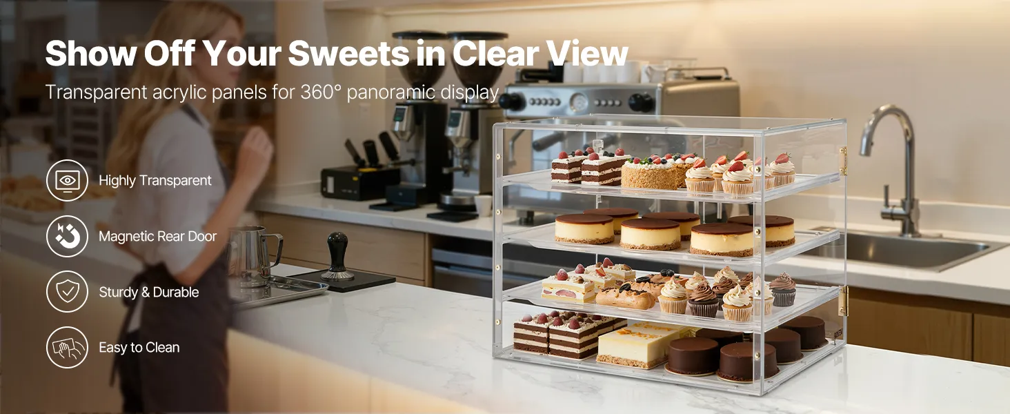 VEVOR Vetrina per Pasticceria da Banco, Espositore Vetrina per Pasticceria Commerciale a 4 Ripiani, Portapane in Acrilico Trasparente per Cucina Torte con Porta Posteriore Magnetica per Biscotti