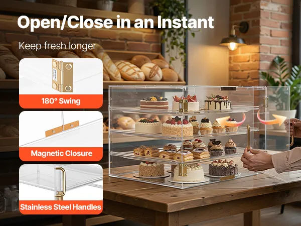La vetrina per pasticceria è dotata di robuste doppie cerniere e porte posteriori magnetiche per un allineamento preciso e una chiusura ermetica. Mantiene la freschezza al suo interno, consente l'accesso posteriore per il rifornimento ed evita oscillazioni o danni.