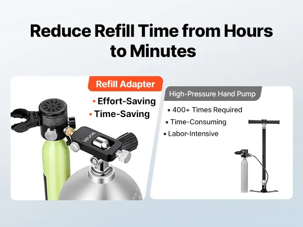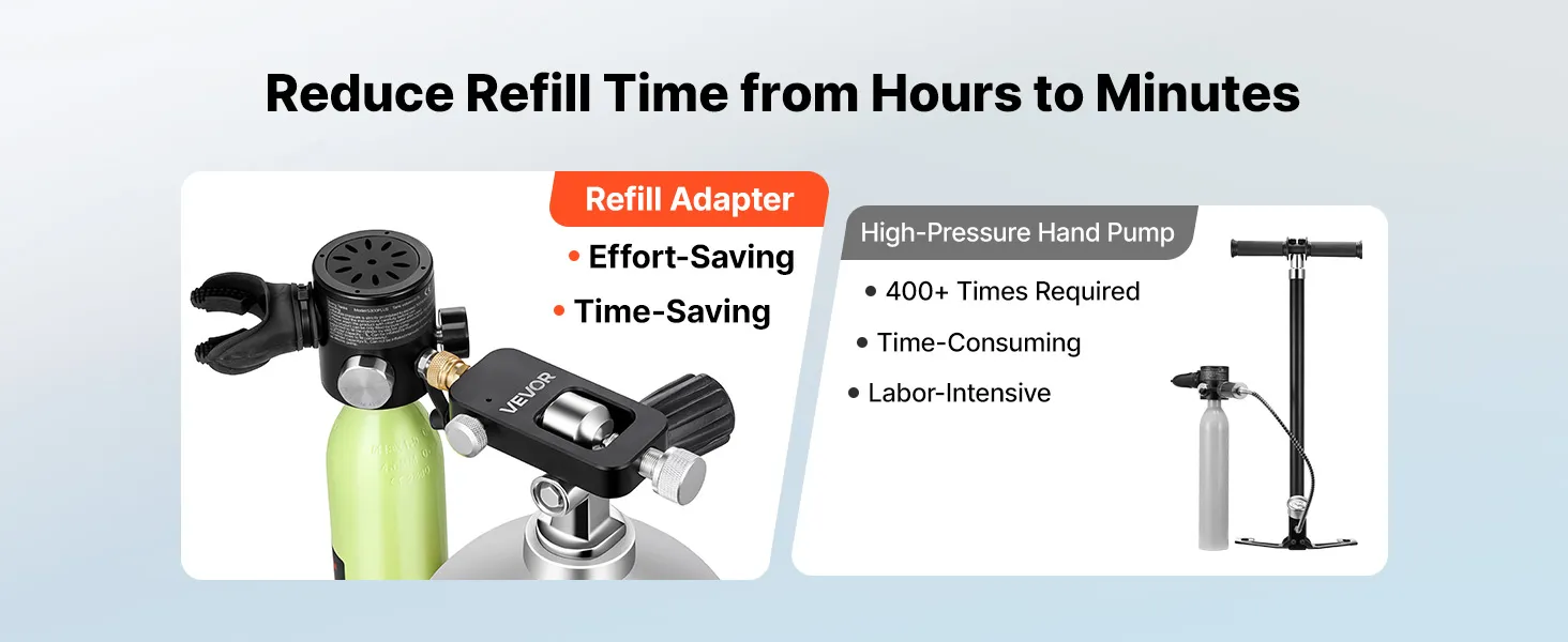 Dite addio al pompaggio manuale di una bombola da 1 litro per 800 cicli. Collegando questo adattatore per bombole subacquee a fonti d'aria professionali, i tempi di ricarica si riducono da ore a pochi minuti.