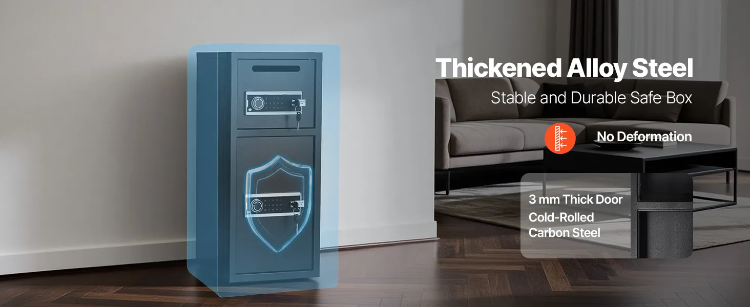 Struttura in acciaio rinforzato: la cassaforte è realizzata in acciaio legato laminato a freddo di alta qualità e presenta una porta spessa 3 mm e quattro robusti catenacci per una chiusura sicura