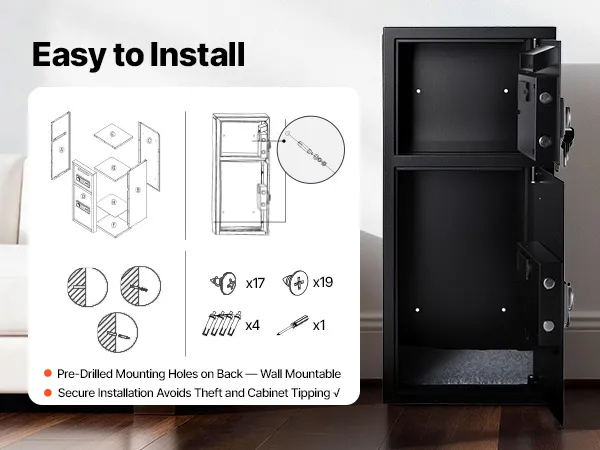 Installazione facile e sicura: la cassaforte viene consegnata smontata, ma può essere montata in modo rapido e semplice. Grazie ai quattro fori preforati sul retro, può essere facilmente fissata a una parete o a un mobile