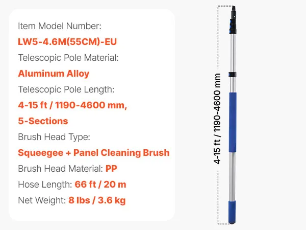 Questo kit con asta telescopica ad acqua è regolabile fino a 4,6 m. La spazzola con testa girevole a 180° e doppia uscita d’acqua garantisce una pulizia completa. Include connettori rapidi e tubo da 20 m per un’installazione semplice e un uso versatile.