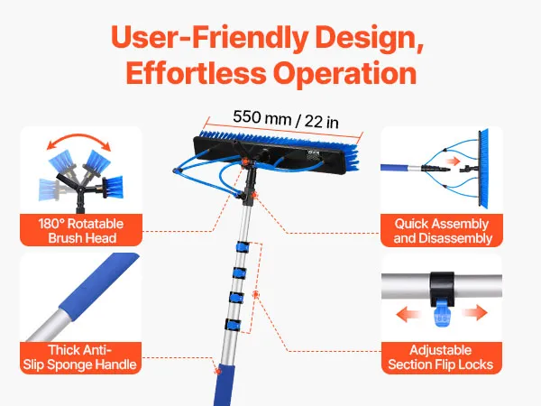 Questa spazzola per pannelli solari è facile da montare e smontare. Dotata di una testina girevole a 180° e larga 56 cm (22 pollici), offre una copertura di pulizia più ampia. L'impugnatura in spugna spessa garantisce una presa comoda per una pulizia facile ed efficiente.
