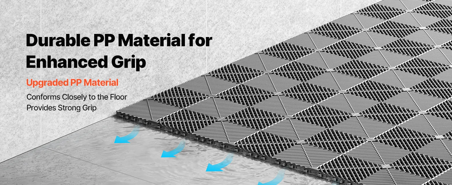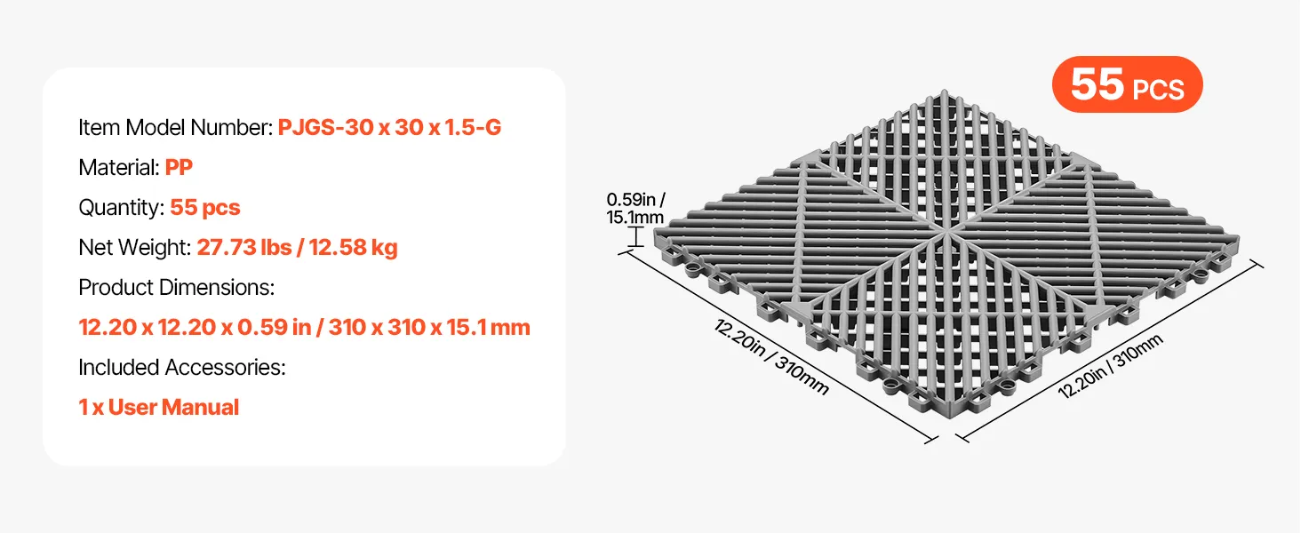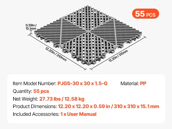 VEVOR Set di Tappetini di Drenaggio ad Incastro 55 pezzi, Set di Piastrelle 31 x 31 cm per Pavimenti da Garage Antiscivolo Drenante Materiale in PP Pavimentazione Modulare per Ambienti Umidi, Grigio