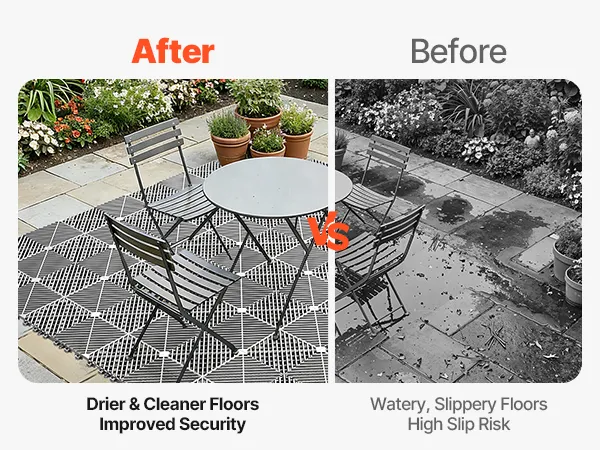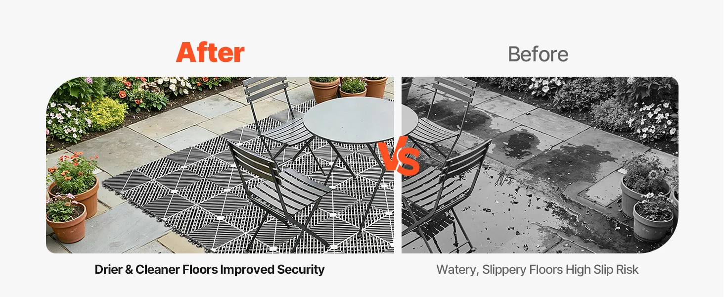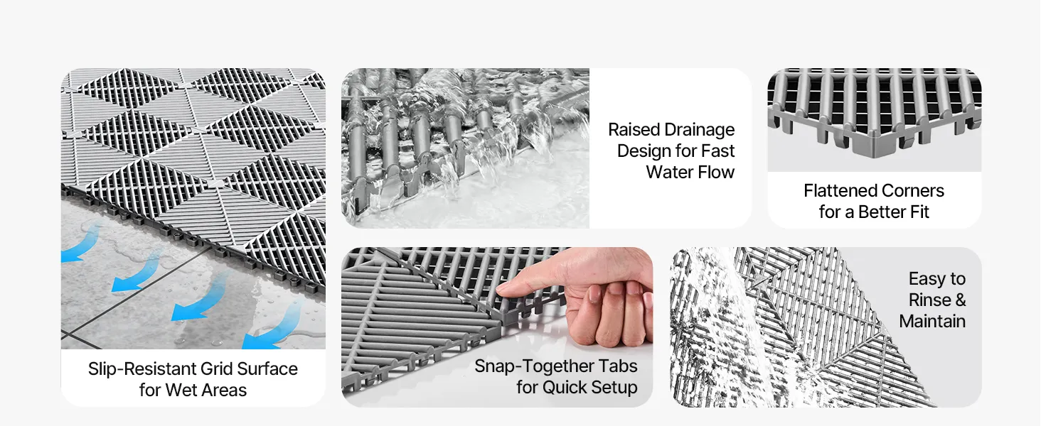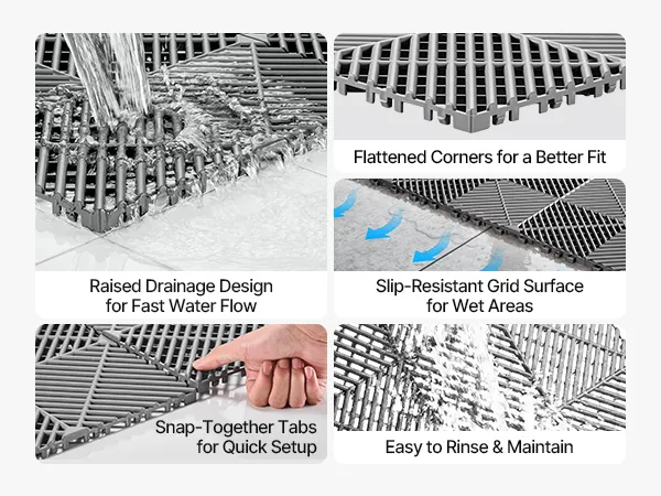 Impermeabile e antiscivolo: Questo tappetino drenante ad incastro è dotato di un sistema di drenaggio migliorato e più spesso che convoglia l'acqua in modo rapido ed efficiente. Questo riduce l'acqua superficiale, mantiene l'area pulita e fresca e garantisce un appoggio sicuro nelle zone umide