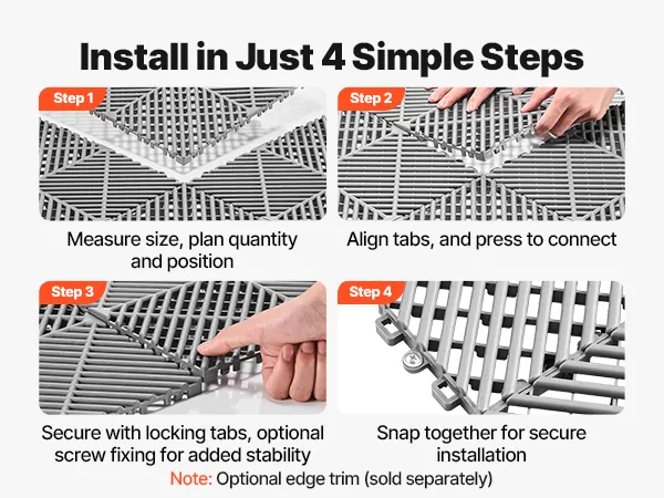 Installazione semplice e design personalizzato: Grazie al pratico sistema a clic, le piastrelle per pavimenti del garage possono essere posate in modo rapido e semplice. I profili perimetrali opzionali (venduti separatamente) consentono un adattamento preciso