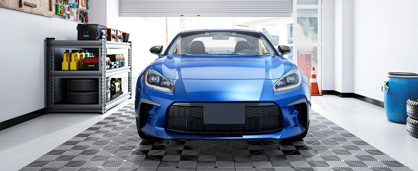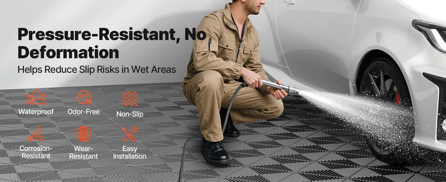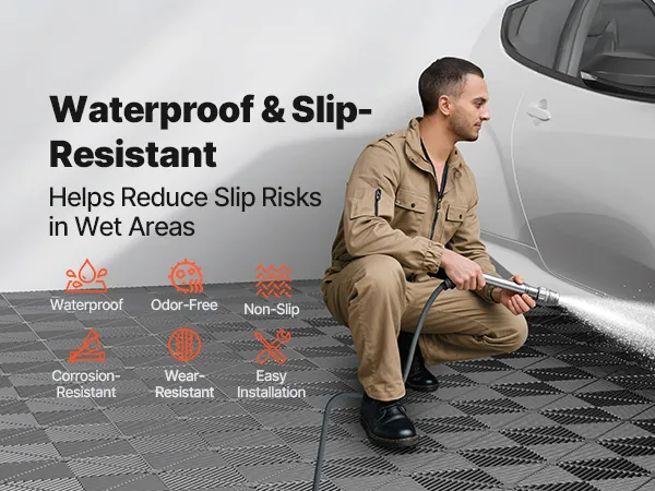 Questa piastrella modulare per pavimenti da garage con superficie antiscivolo aumenta l'aderenza nelle zone bagnate, contribuendo così a ridurre il rischio di scivolamento.