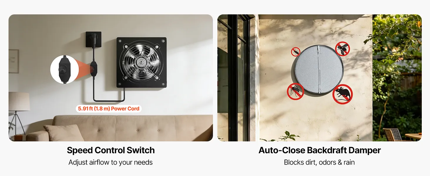 Questo aspiratore a parete è dotato di un interruttore di controllo della velocità integrato, che consente di personalizzare il flusso d'aria da basso ad alto per una ventilazione efficiente, comfort e risparmio energetico in qualsiasi ambiente.