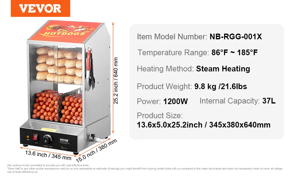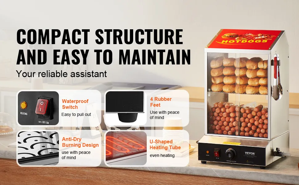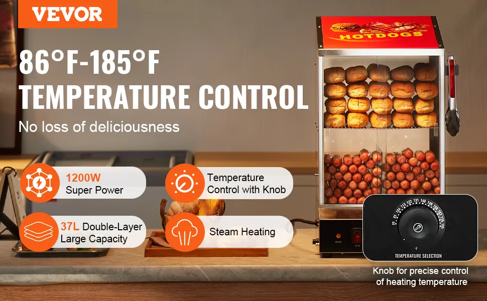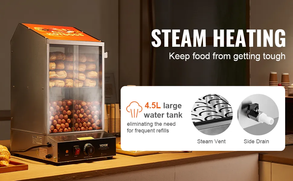 Controllo della temperatura con manopola: ti preoccupa che i tuoi hot dog diventino freddi? Non preoccuparti! Hot dog e panini vengono riscaldati tramite vapore interno, assicurando che ogni articolo rimanga caldo.