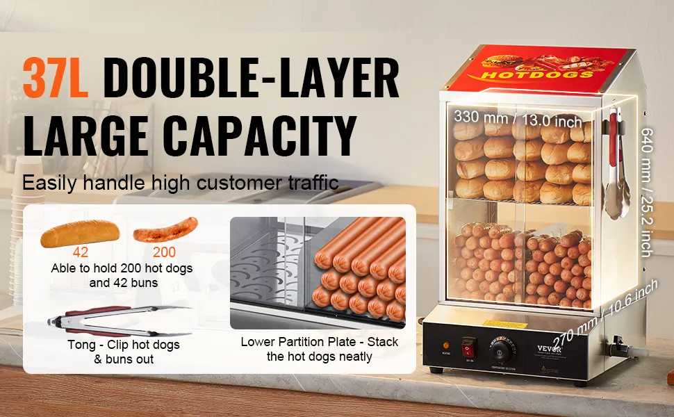 Grande capacità a 2 ripiani: dimensioni: 13,58 x 14,96 x 25,2 pollici / 345 x 380 x 640 mm. La nostra vetrina è dotata di 2 spaziosi ripiani interni per alimenti, in grado di contenere ed esporre circa 200 hot dog e 42 panini, soddisfacendo tutte le tue esigenze.