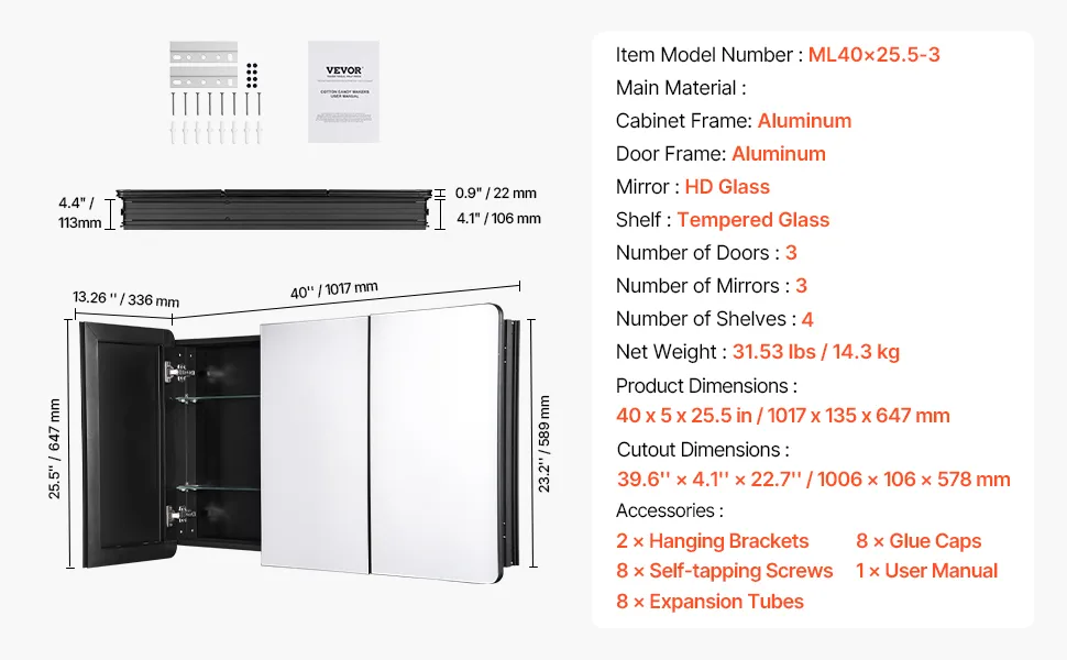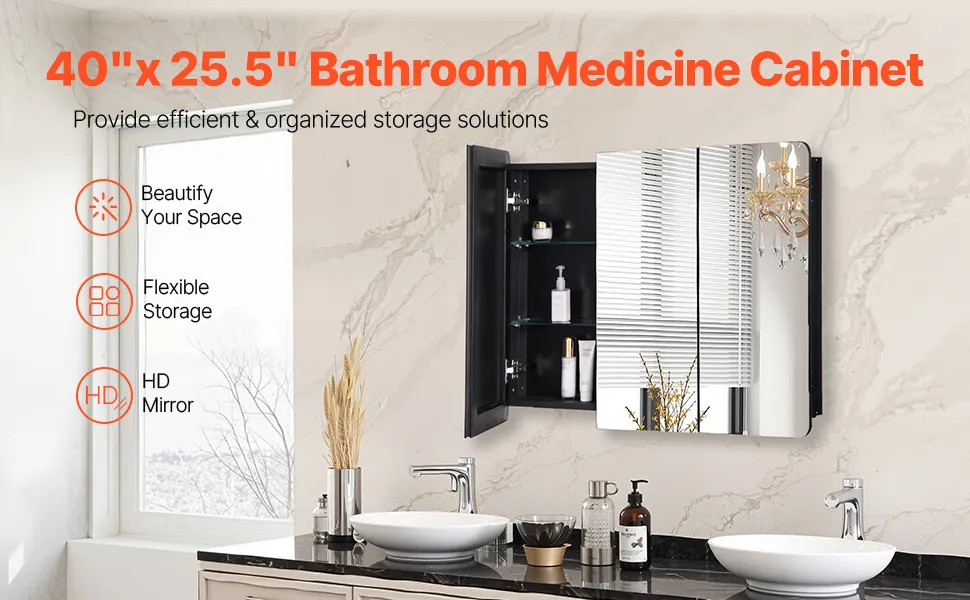 VEVOR Armadietto per Medicinali 1017 x 647 mm Armadietto per Medicinali a Specchio, 3 Ante a Specchio, Ripiani in Vetro Regolabili, Installazione a Incasso e a Parete, Telaio Alluminio di Alta Qualità