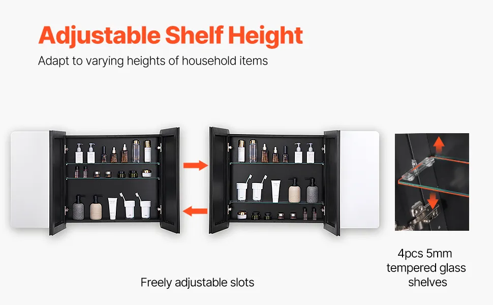 I ripiani dell'armadietto dei medicinali a specchio possono essere facilmente regolati verso l'alto e verso il basso, offrendo uno spazio di archiviazione personalizzato per oggetti di tutte le dimensioni: ideale per flaconi alti, piccoli cosmetici e tutto il resto.