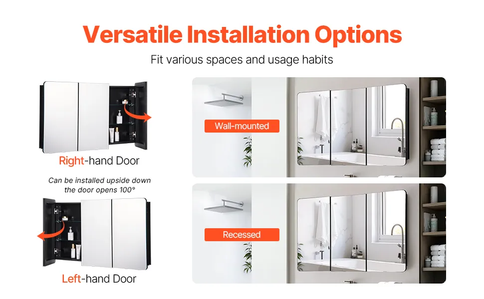 Progettato sia per installazioni a parete che a incasso, lo specchio mobiletto per il bagno può essere capovolto per adattarsi alle aperture delle porte a sinistra o a destra. Si adatta senza sforzo a vari layout del bagno, offrendo maggiore praticità in base alle tue preferenze.