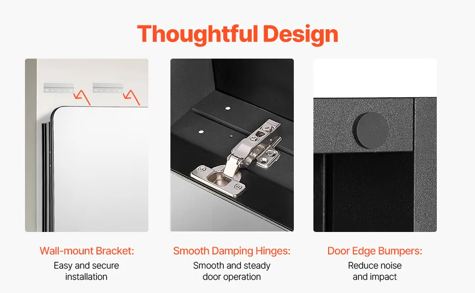 La staffa a parete semplifica l'installazione e aumenta la stabilità. L'armadietto dei medicinali con specchio è dotato di cerniere lisce e ammortizzate per un funzionamento silenzioso della porta e cuscinetti ammortizzanti di alta qualità per ridurre al minimo rumore.