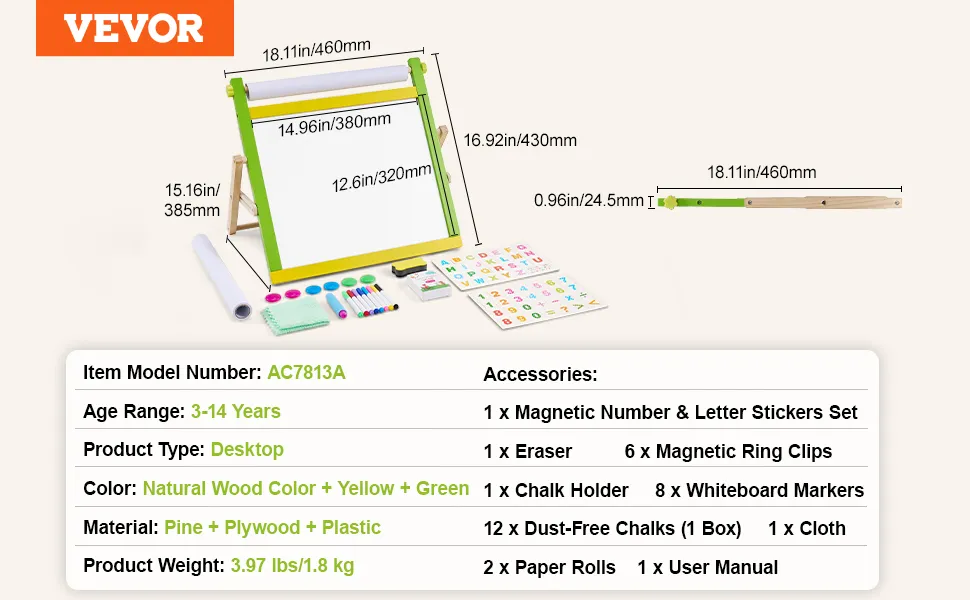 VEVOR Cavalletto da Tavolo per Bambini 3 in 1, Tavolo da Disegno Pieghevole Portatile in Legno a Doppia Faccia con Lavagna Magnetica, Lavagna, Rotolo di Carta, con Accessori per Pittura per Ragazzi