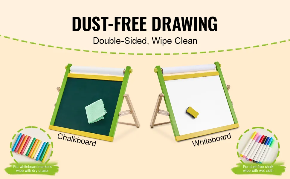 Entrambi i lati del cavalletto per bambini sono privi di polvere, quindi non dovrai più preoccuparti delle particelle nocive. Dopo il divertimento, basta pulirlo con un panno umido e asciugarlo ed è come nuovo.