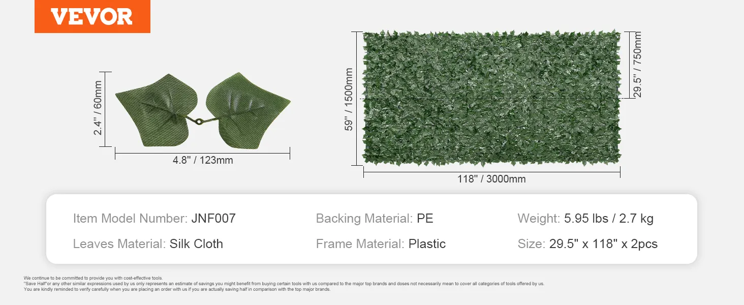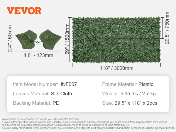 Accento funzionale: inizia i tuoi progetti fai-da-te nel tuo giardino, patio, balcone o area piscina. Lo schermo per la privacy della recinzione di edera non richiede irrigazione, rifilatura o potatura, il che consente di risparmiare tempo e fatica.