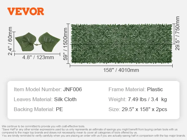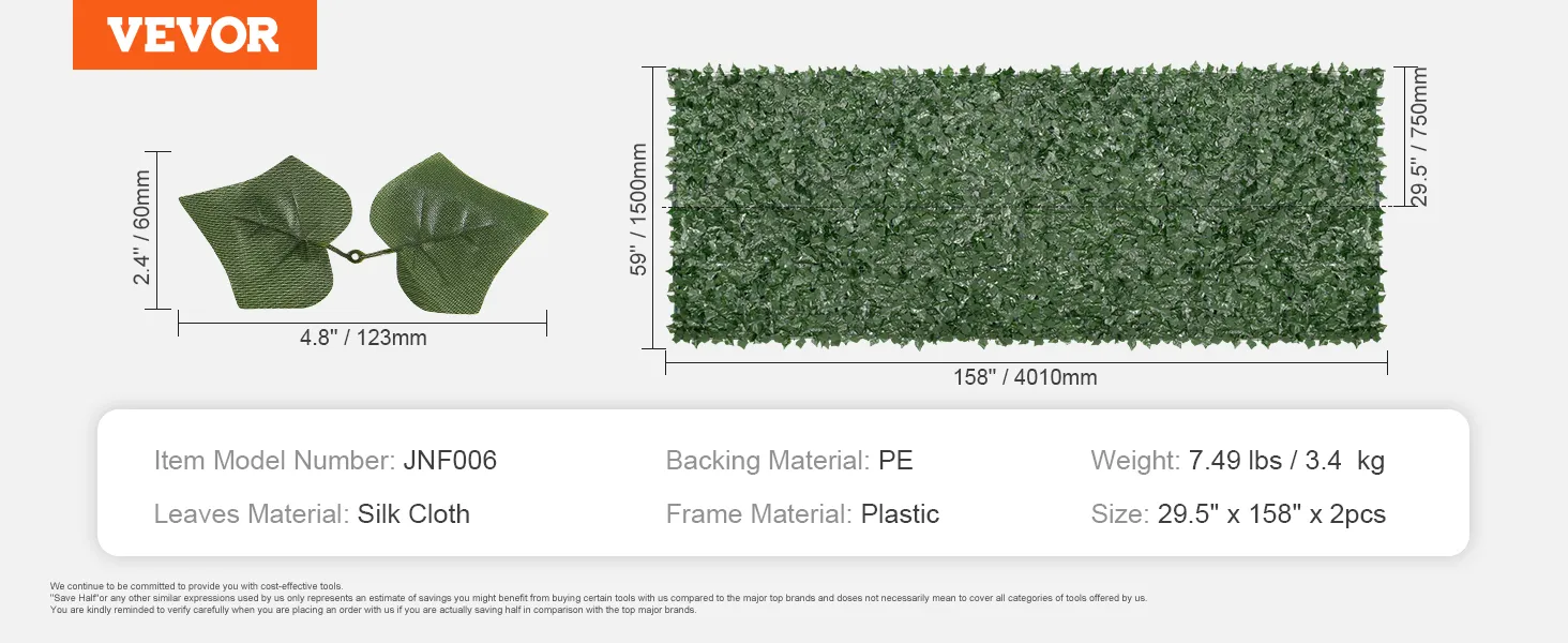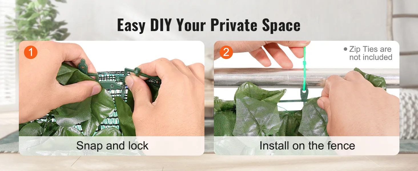Accento funzionale: inizia i tuoi progetti fai-da-te nel tuo giardino, patio, balcone o area piscina. Lo schermo per la privacy della recinzione di edera non richiede irrigazione, rifilatura o potatura, il che consente di risparmiare tempo e fatica.
